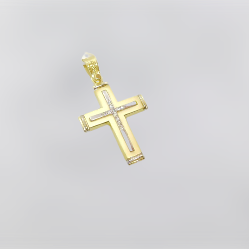Γυναικείος σταυρός Triantos από χρυσό 14 καρατίων σε ματ φινίρισμα , στολισμένος με λευκές πέτρες ζιρκόν.